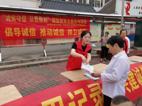 為進(jìn)一步弘揚(yáng)中華民族重信守諾的傳統(tǒng)美德,營造講誠實守信用的社會氛圍,著力提升居民信用意識,助推文明城市創(chuàng)建,6月14日上午,清溪辦事處在轄區(qū)開展以“誠實守信、從我做起”為主題的誠信教育宣傳活動。