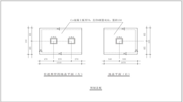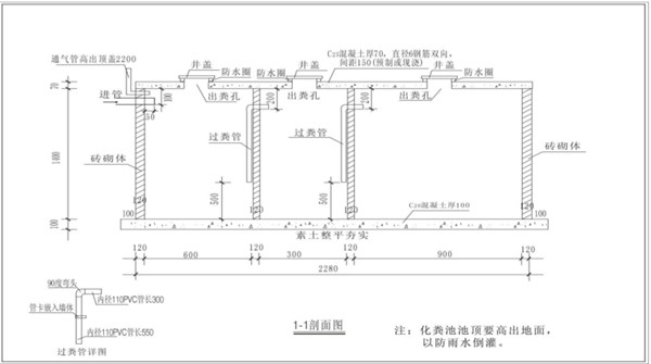 磚砌式化糞池:考慮防滲,不可用水泥空心磚砌筑化糞池,宜雙面粉刷。應(yīng)采用混凝土底板,并配置分布式鋼筋防止開裂。每一格要有一塊活動(dòng)蓋板,便于清掏和檢修,蓋板要求統(tǒng)一使用窨井蓋板;磚砌式化糞池位設(shè)置排氣管。室外化糞池應(yīng)高出地面,防止雨水滲入。