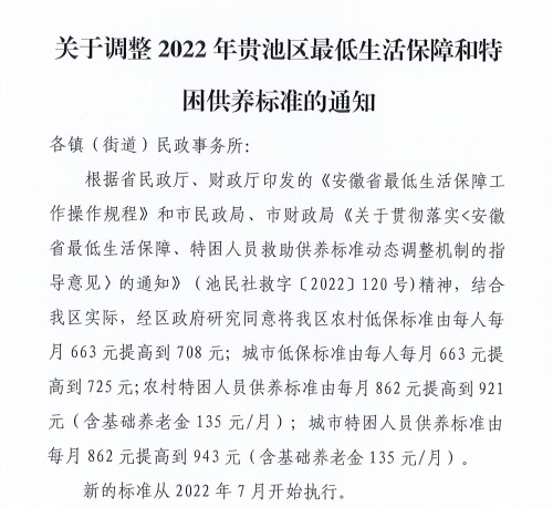 關(guān)于調(diào)整2022年貴池區(qū)最低生活保障和特困供養(yǎng)標準的通知