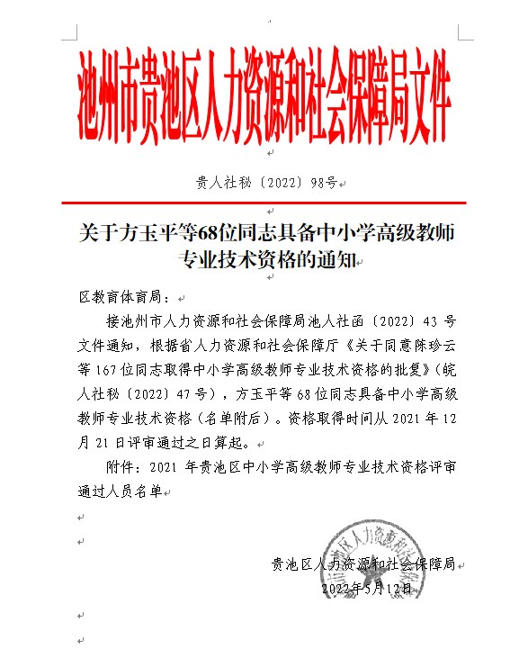 關(guān)于方玉平等68位同志具備中小學(xué)高級教師專業(yè)技術(shù)資格的通知