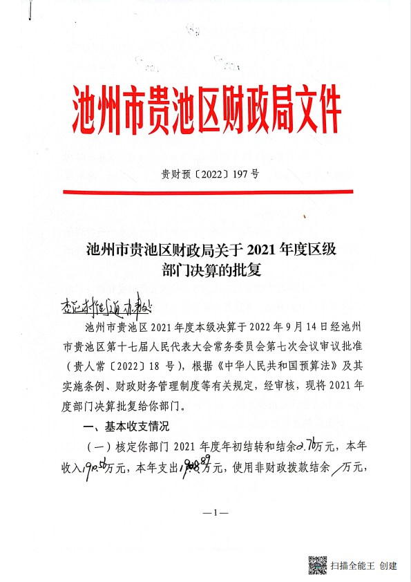 名稱: 貴池區(qū)杏花村街道辦事處2021年部門決算批復(fù) 文號: