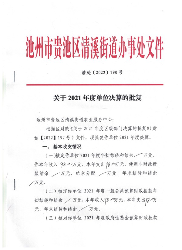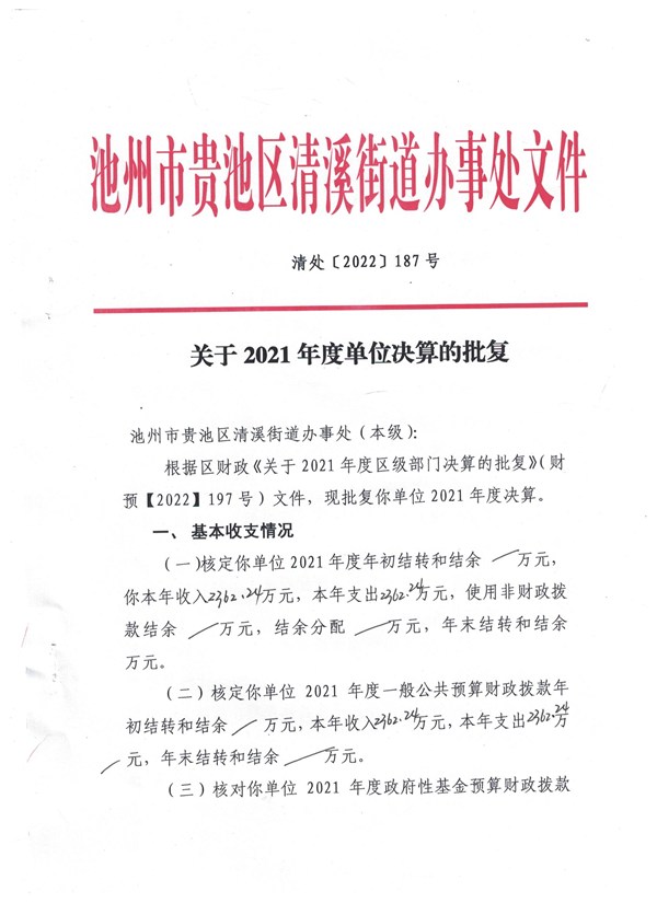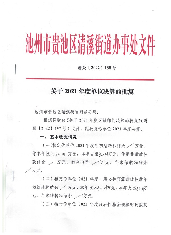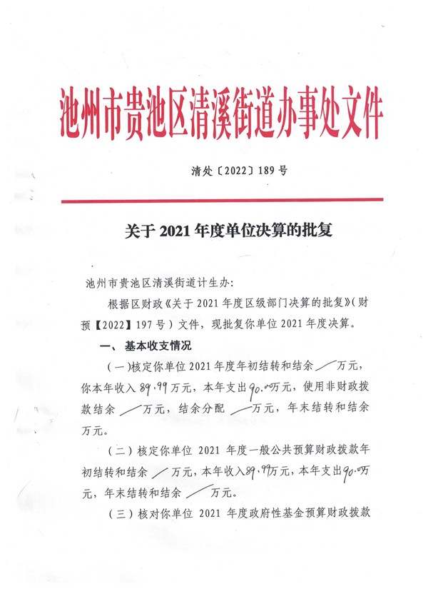 池州市貴池區(qū)清溪街道辦事處2021年單位決算批復(fù)