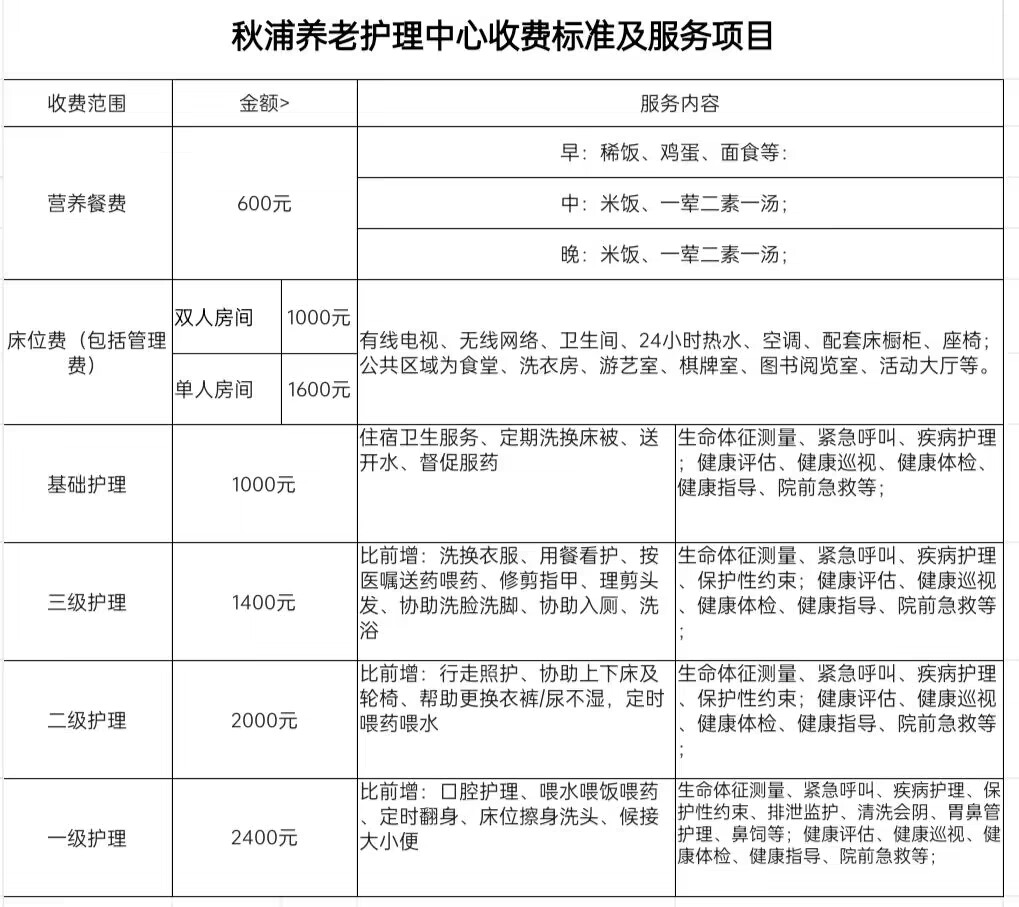 秋浦養(yǎng)老護(hù)理中心收費(fèi)標(biāo)準(zhǔn)及服務(wù)項(xiàng)目