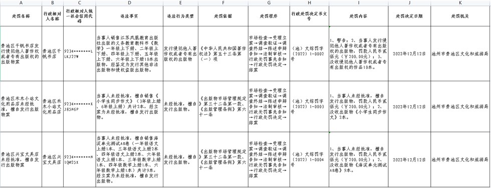 貴池區(qū)文化和旅游局出版物行政處罰結(jié)果