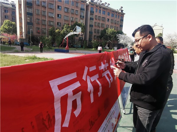 活動(dòng)現(xiàn)場(chǎng),街道志愿者組織群眾在簽名布上簽下名字,以實(shí)際行動(dòng)對(duì)踐行“厲行節(jié)約、反對(duì)浪費(fèi)”做出莊嚴(yán)承諾,表明反對(duì)浪費(fèi)、厲行節(jié)約的決心。