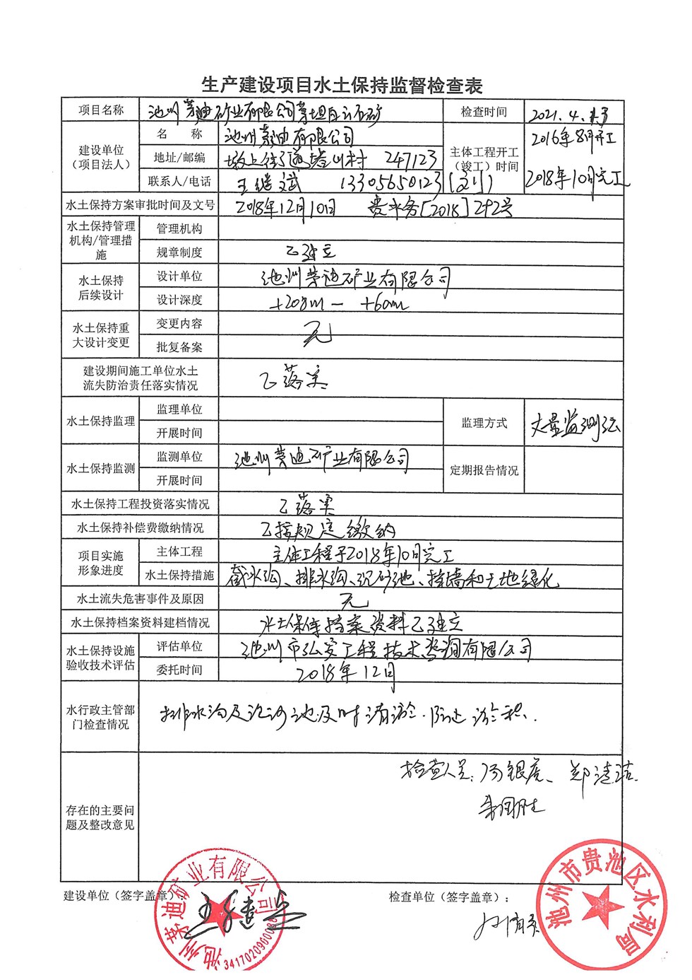 茅迪公司白云石礦工程水土保持監(jiān)督檢查表