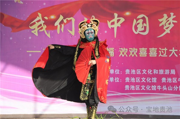 而由區(qū)文化館文藝志愿小分隊(duì)帶來的川劇變臉則直接將演出推向高潮。在一張張面具變化中,一陣陣掌聲和歡呼此起彼伏?!把莸镁?,看得過癮!”現(xiàn)場(chǎng)觀眾激動(dòng)地表示?!俺刂萑巳耸歉枋?,一人唱來萬(wàn)人和,早歌泡綠秋浦水,晚歌碎紅杏花坡?!甭牭绞煜さ姆窖?,同時(shí)在演唱者生動(dòng)演唱的調(diào)動(dòng)下,一曲貴池民歌《朵朵山花搖春波》引得觀眾們跟唱,臺(tái)上臺(tái)下好不熱鬧。