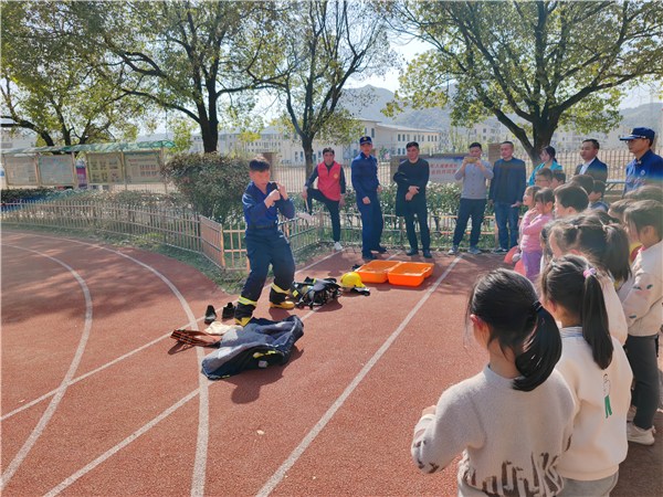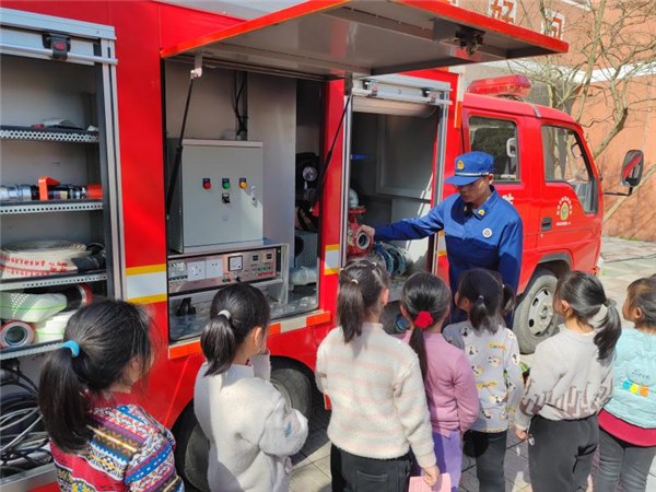 消防演練活動(dòng)后,學(xué)校部分班級(jí)學(xué)生在牌樓鎮(zhèn)消防應(yīng)急工作站的消防員叔叔的帶領(lǐng)下,走近消防救援車(chē),進(jìn)一步了解了車(chē)上很多消防救援專(zhuān)用設(shè)備及使用方法。另外,消防員叔叔還給孩子們演示了穿消防服的全過(guò)程。