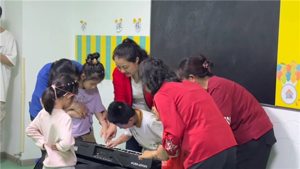 教孩子們音樂(lè)的滕老師是第二次接觸這樣“星星的孩子”,她鼓勵(lì)孩子們自己勇敢地上來(lái)觸摸電子琴、感受音樂(lè)的美妙,她還邊彈奏邊帶孩子們唱起了兒歌《如果感到快樂(lè)你就拍拍手》。