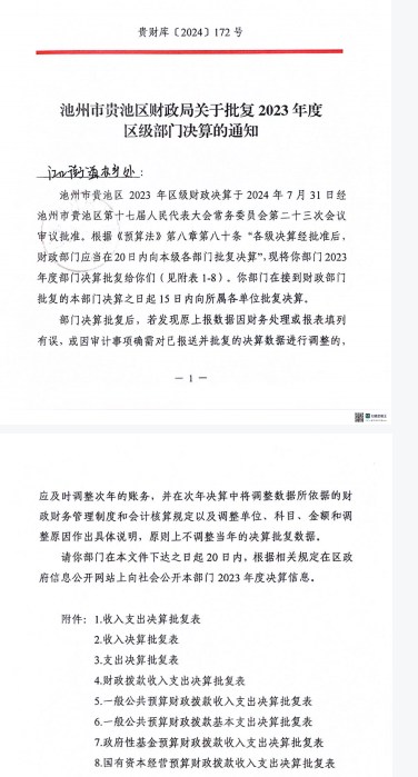 名稱: 池州市貴池區(qū)人民政府江口街道辦事處2023年部門決算批復(fù) 文號: