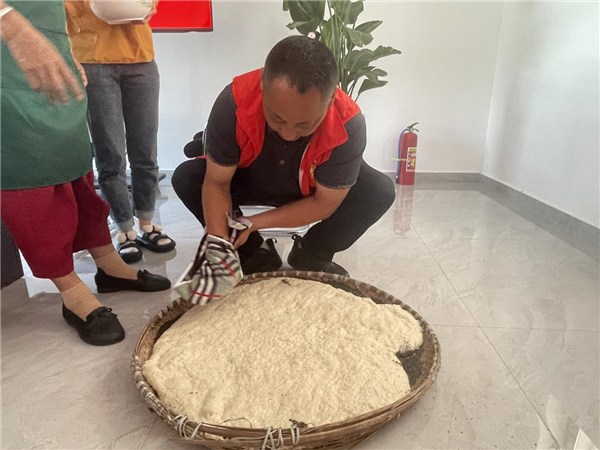活動現(xiàn)場,在一聲聲“嘿呦~嘿呦~”的吶喊中,志愿者們深一錘淺一錘地捶打著糯米團(tuán),大家都沉浸在歡樂的氛圍中。敲打、攪拌,熱氣騰騰,米香氤氳,志愿者們將糯米捶打好之后,扯開、定型,撒上白糖、芝麻,一團(tuán)團(tuán)軟糯香甜的糍粑團(tuán)子就做好了,散發(fā)出誘人的香氣。