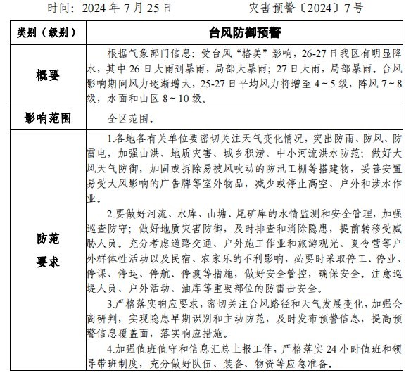 【預警信息】貴池區(qū)應(yīng)急管理局預警信息(災(zāi)害預警〔2024〕7號 )臺風防御預警