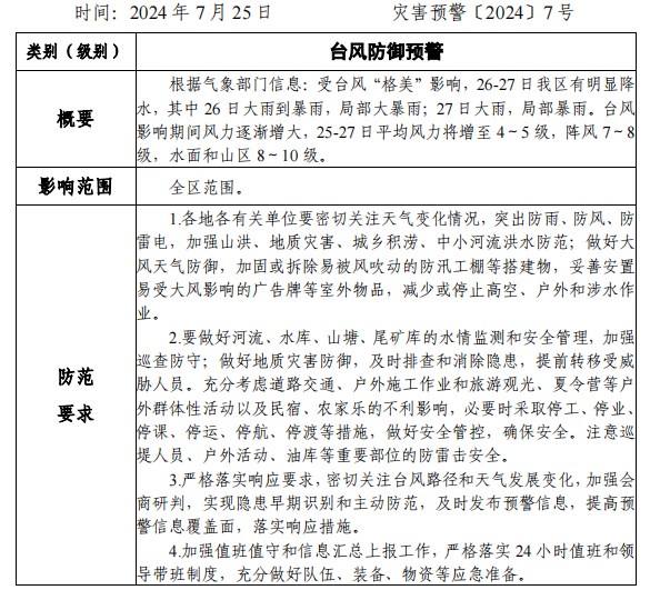 | 名稱: | 【預(yù)警信息】貴池區(qū)應(yīng)急管理局預(yù)警信息(災(zāi)害預(yù)警〔2024〕7號(hào) )臺(tái)風(fēng)防御預(yù)警 | 文號(hào): | 無 |