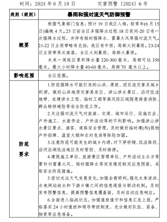 名稱: 【預警信息】暴雨和強對流天氣防御預警 文號: