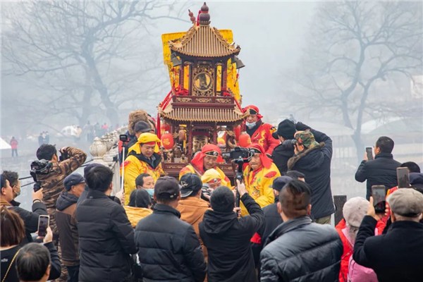 廟會(huì)現(xiàn)場,各社的龍燈、獅舞、竹馬、高蹺盡獻(xiàn)技藝,其時(shí),鼓樂喧天,人聲鼎沸,旗鑼傘銃,蔚為壯觀,由“傘孩兒”舞傘領(lǐng)頭,年首喊“青山廟段”,抬龍亭之人聞聲,跟著節(jié)奏將龍亭一上一下抖動(dòng),似點(diǎn)頭狀。人們爭先恐后,紛紛涌向儺戲龍亭,舉起手機(jī)、相機(jī)記錄下這個(gè)獨(dú)具地域特色的文化瞬間。