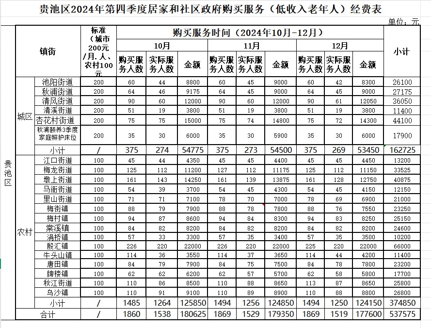 2024年第4季度貴池區(qū)居家和社區(qū)政府購(gòu)買服務(wù)(低收入老年人)經(jīng)費(fèi)表