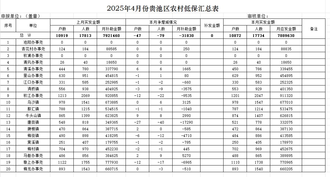貴池區(qū)2025年4月份農(nóng)村低保匯總表