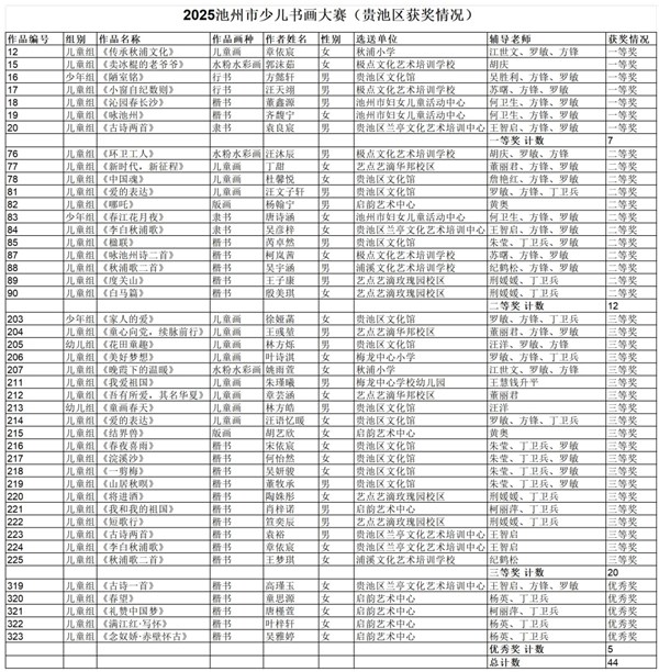 近日,池州市文化館公布了《2025年池州市少兒書畫大賽獲獎名單公示》、《2025年池州市“六一”少兒文藝調演獲獎名單公示》,貴池區(qū)組織選送的多項少兒書畫作品、舞蹈作品獲獎。其中,榮獲池州市少兒書畫大賽一等獎7項,二等獎12項,三等獎30項,優(yōu)秀獎5項(如下圖所示);榮獲池州市“六一”少兒文藝調演一等獎1項,二等獎1項,優(yōu)秀獎3項(如下圖所示)。