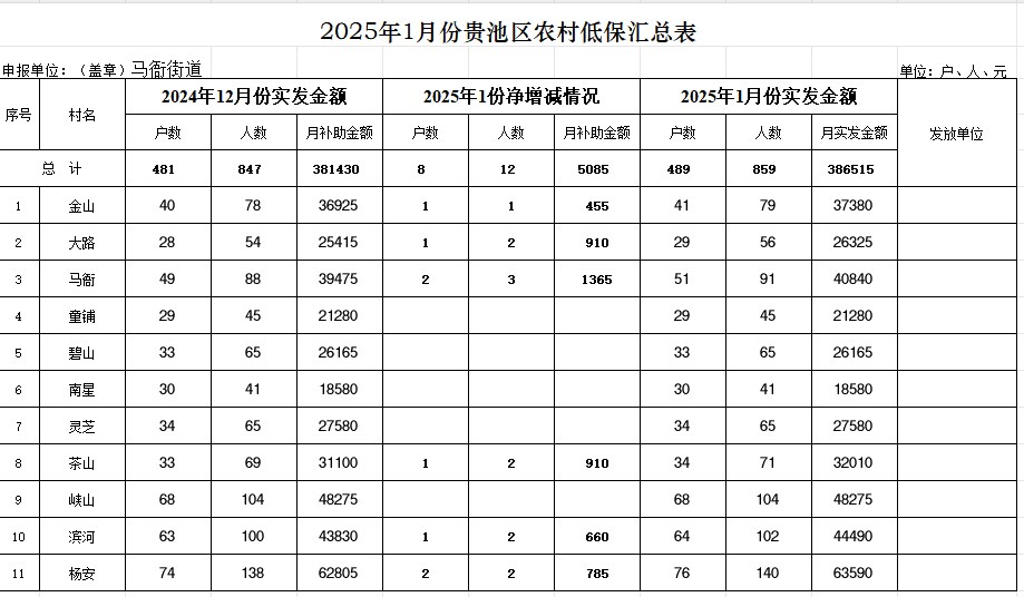馬衙街道2025年1月份農(nóng)村低保匯總表