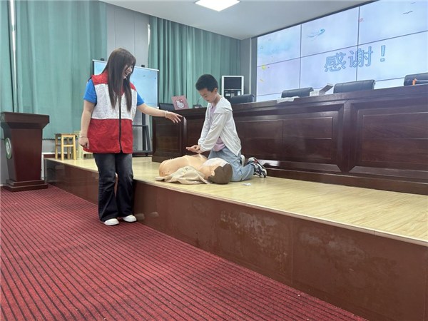 針對(duì)同伴溺水的情況,講師們重點(diǎn)傳授了科學(xué)的施救技巧。他們強(qiáng)調(diào),未成年人切勿盲目下水施救,應(yīng)立即大聲呼救,尋求成年人的幫助,同時(shí)可利用身邊的竹竿、繩索等物品進(jìn)行間接施救。此外,講師們還現(xiàn)場(chǎng)演示了心肺復(fù)蘇術(shù)在溺水急救中的應(yīng)用,讓師生們更加直觀地了解急救流程和操作要點(diǎn)。