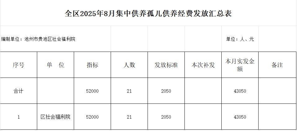 名稱: 貴池區(qū)2025年8月份集中供養(yǎng)孤兒供養(yǎng)經(jīng)費發(fā)放匯總表 文號: