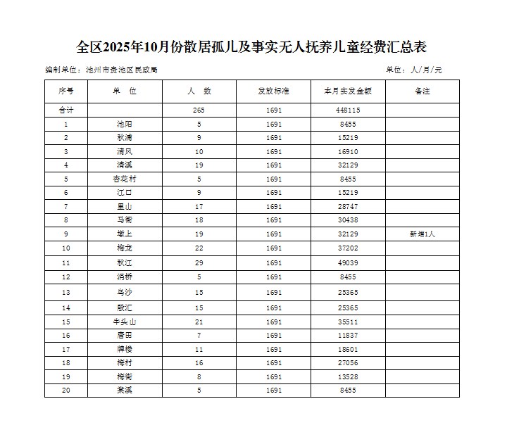 貴池區(qū)2025年10月份散居孤兒供養(yǎng)經(jīng)費(fèi)發(fā)放匯總表