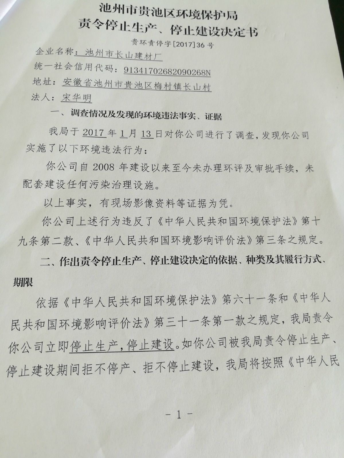 | 名稱(chēng): | 池州市貴池區(qū)環(huán)境保護(hù)局關(guān)于池州市長(zhǎng)山建材廠(chǎng)責(zé)令停止生產(chǎn)、停止建設(shè)決定書(shū) | 文號(hào): | 無(wú) |
