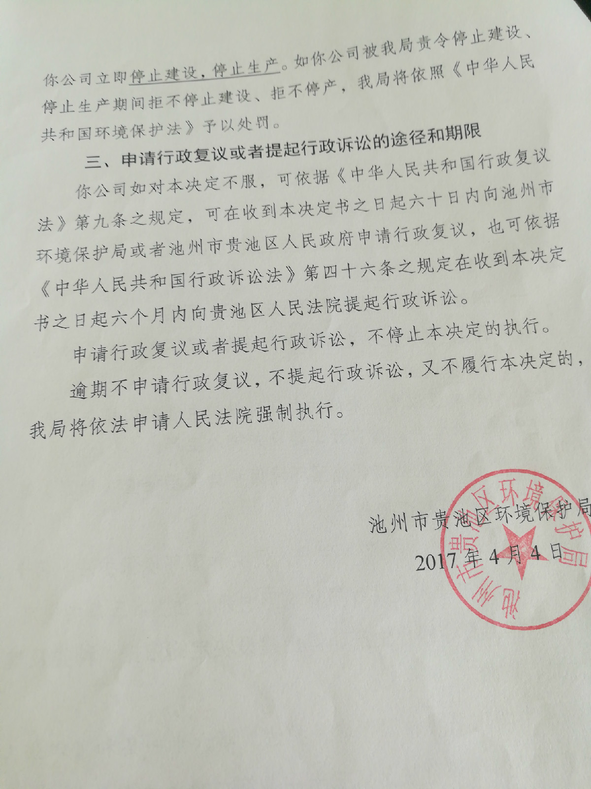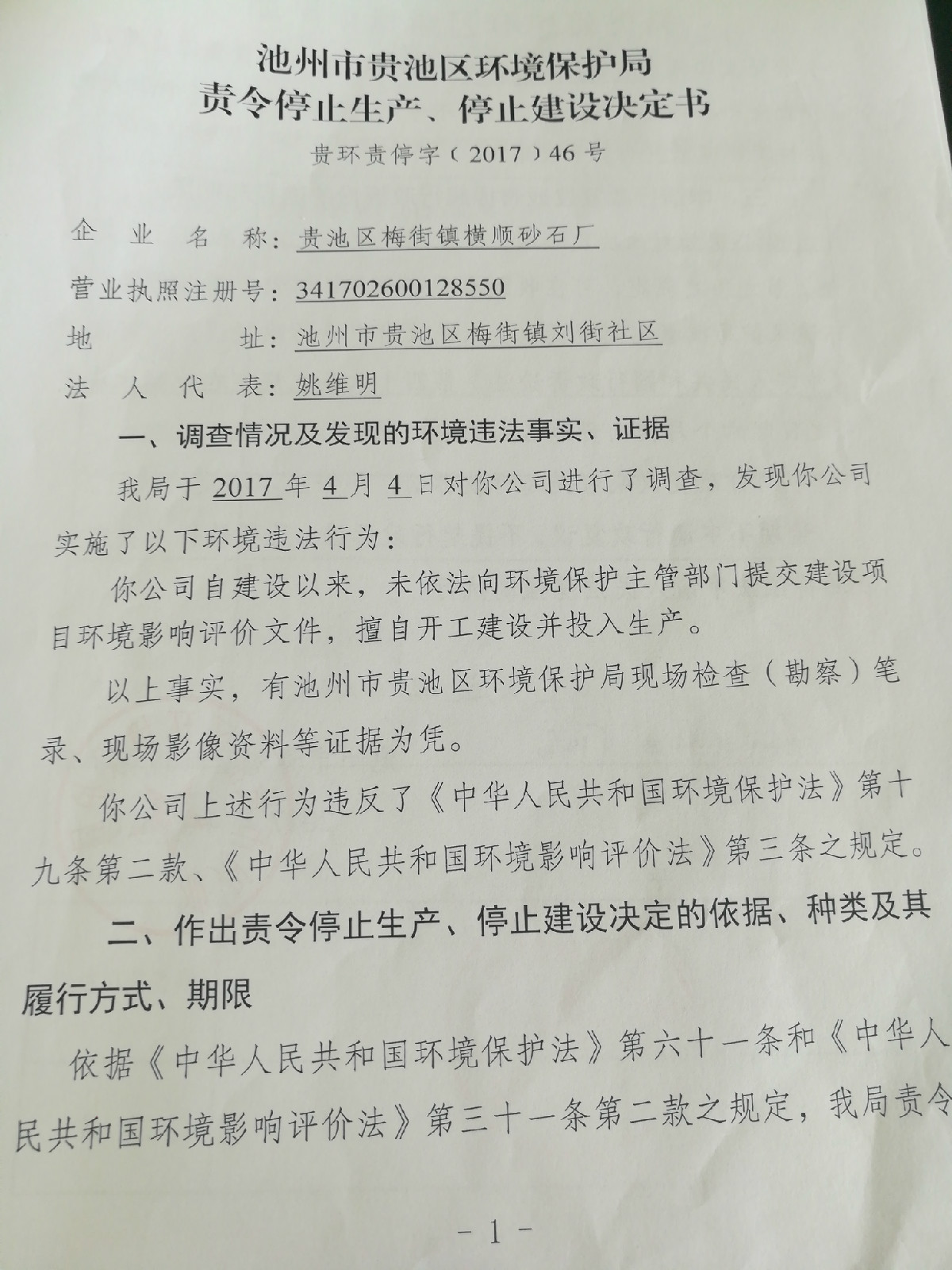 | 名稱: | 池州市貴池區(qū)環(huán)境保護局關(guān)于貴池區(qū)梅街鎮(zhèn)橫順砂石廠責(zé)令停止生產(chǎn)、停止建設(shè)決定書 | 文號: | 無 |