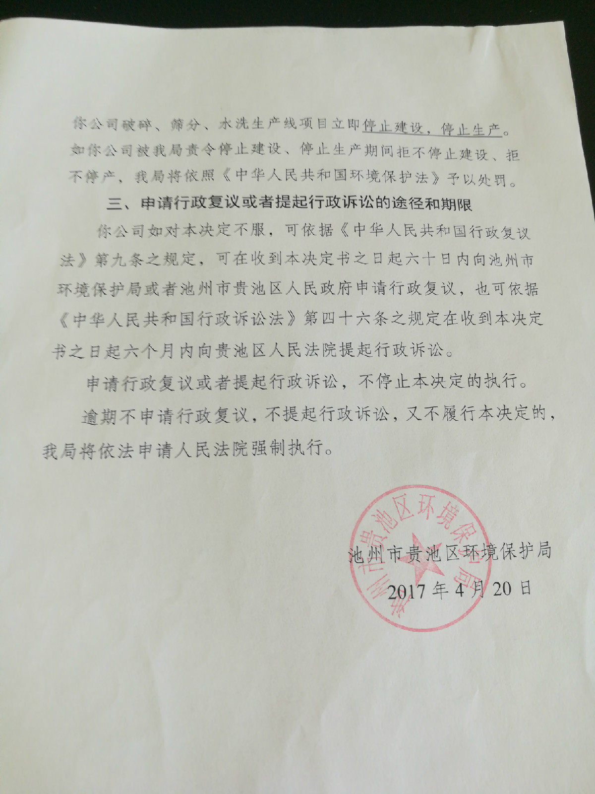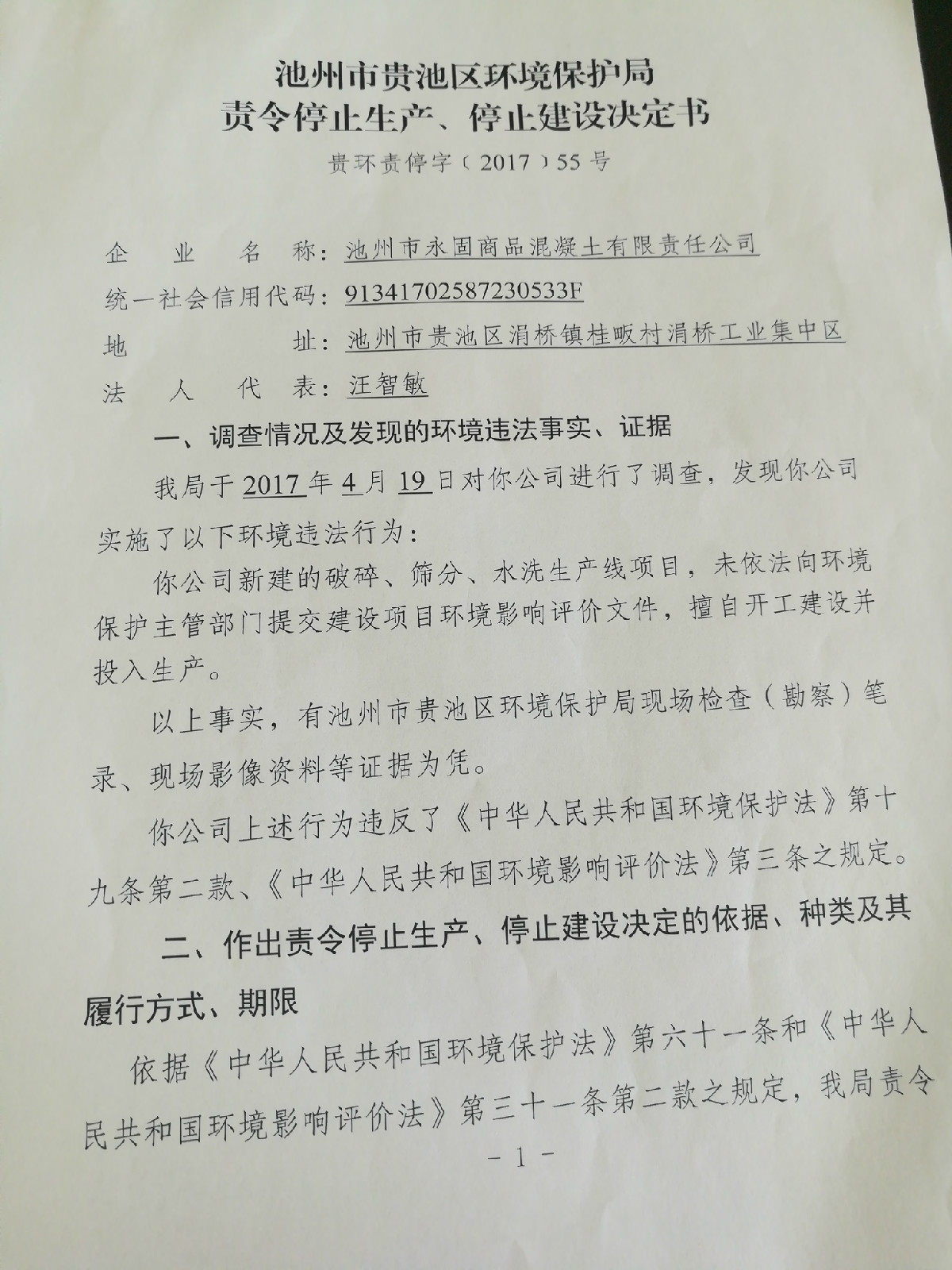 | 名稱: | 池州市貴池區(qū)環(huán)境保護(hù)局關(guān)于池州市混凝土有限責(zé)任公司責(zé)令停止生產(chǎn)、停止建設(shè)決定書 | 文號: | 無 |