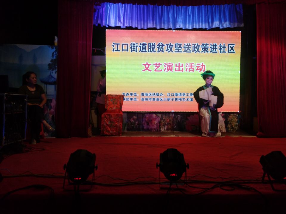 為了豐富全街廣大人民群眾的精神文化生活,弘揚社會主義核心價值觀,充分展示江口經(jīng)濟社會發(fā)展新面貌、新氣象,增強貧困群眾脫貧致富的內(nèi)生動力,推進脫貧攻堅政策落地生根,江口街道邀請了區(qū)黃梅劇團到轄區(qū)內(nèi)6個社區(qū)開展脫貧攻堅政策進社區(qū)文藝巡演活動。