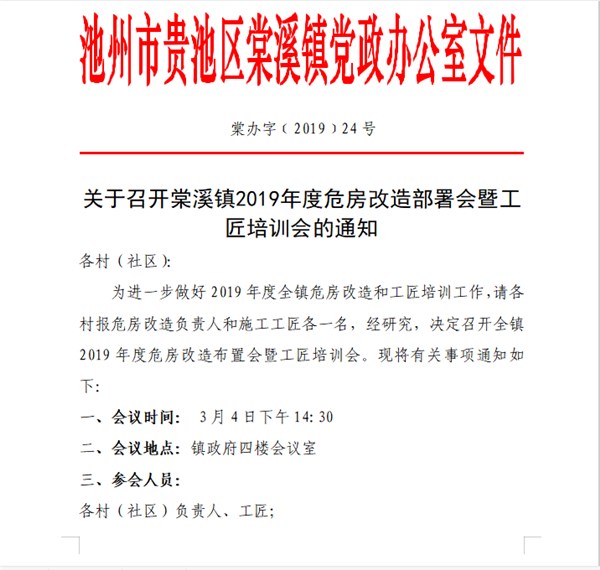| 名稱: | 【本級(jí)文件】關(guān)于召開棠溪鎮(zhèn)2019年度危房改造部署會(huì)暨工匠培訓(xùn)會(huì)的通知 | 文號(hào): | 無 |