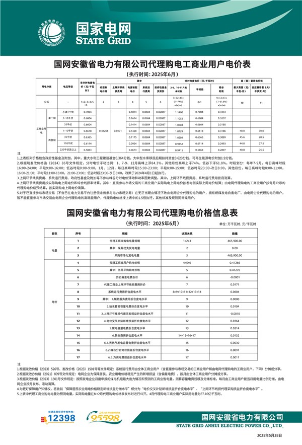 國網(wǎng)安徽省電力有限公司2025年6月代理購電價格信息表