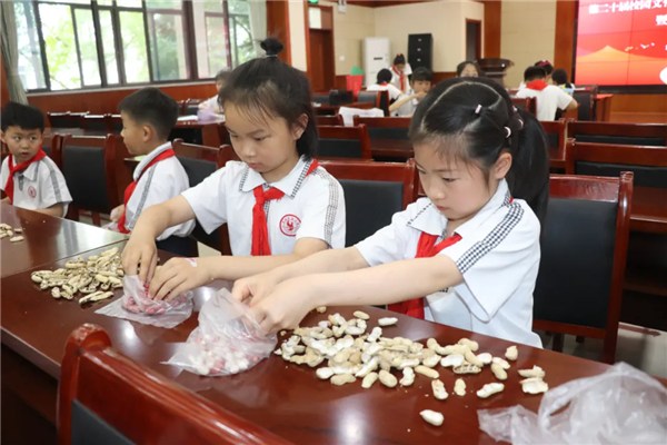 活動(dòng)伊始,“現(xiàn)場(chǎng)剝花生比賽”瞬間點(diǎn)燃了孩子們的熱情。隨著裁判老師一聲令下,比賽現(xiàn)場(chǎng)化作“勞動(dòng)小工坊”:有的孩子熟練地捏住花生兩端,輕輕一掰,飽滿的花生米便“蹦”了出來(lái);有的孩子則小心翼翼研究花生殼的紋路,在反復(fù)嘗試中尋找省力的技巧。剝殼聲“咔嚓咔嚓”此起彼伏,像極了一首歡快的勞動(dòng)協(xié)奏曲。這場(chǎng)充滿生活氣息的勞動(dòng)實(shí)踐,不僅鍛煉了孩子們手部的精細(xì)動(dòng)作,更讓“一粥一飯,當(dāng)思來(lái)處不易”的道理從課本走進(jìn)現(xiàn)實(shí),在他們心中種下尊重勞動(dòng)、珍惜糧食的種子。